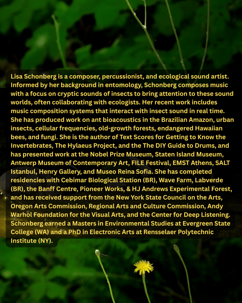 Lisa Schonberg is a composer, percussionist, and ecological sound artist. Informed by her background in entomology, Schonberg composes music with a focus on cryptic sounds of insects to bring attention to these sound worlds, often collaborating with ecologists. Her recent work includes music composition systems that interact with insect sound in real time. She has produced work on ant bioacoustics in the Brazilian Amazon, urban insects, cellular frequencies, old-growth forests, endangered Hawaiian bees, and fungi. She is the author of Text Scores for Getting to Know the Invertebrates, The Hylaeus Project, and the The DIY Guide to Drums, and has presented work at the Nobel Prize Museum, Staten Island Museum, Antwerp Museum of Contemporary Art, FILE Festival, EMST Athens, SALT Istanbul, Henry Gallery, and Museo Reina Sofia. She has completed residencies with Cebimar Biological Station (BR), Wave Farm, Labverde (BR), the Banff Centre, Pioneer Works, & HJ Andrews Experimental Forest, and has received support from the New York State Council on the Arts, Oregon Arts Commission, Regional Arts and Culture Commission, Andy Warhol Foundation for the Visual Arts, and the Center for Deep Listening. Schonberg earned a Masters in Environmental Studies at Evergreen State College (WA) and a PhD in Electronic Arts at Rensselaer Polytechnic Institute (NY).