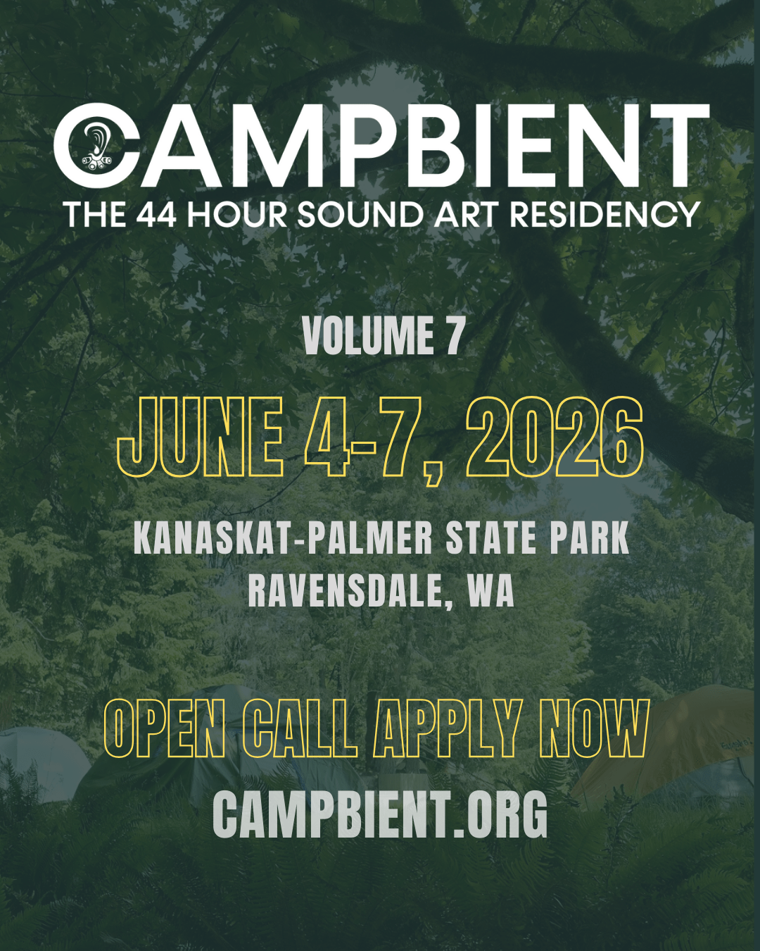 Applications for the 2026 Campbient Residency in Kanaskat-Palmer State Park, Ravensdale, WA open at noon January 5, 2026, otherwise known as International Campbient Day. Priority applications close on March 1, 2026. The dates for this year’s residency are June 4-7, 2026.